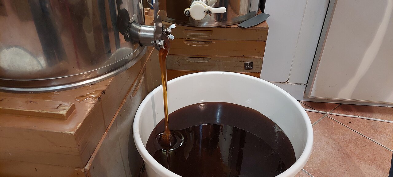 Ende Juli, wenn die Haupttracht vorbei ist und der Honig die volle Reife hat, nehmen wir einen Großteil des Honigs heraus und ergänzen den Raub mit Futtersirup.